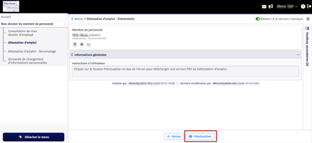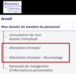 Pour consulter votre attestation d’emploi, vous devez cliquer sur « Attestation d’emploi » dans le menu de gauche. Cliquez sur « Attestation d’emploi recomptage » si vous avez travaillé au recomptage des votes à la Cour du Québec.