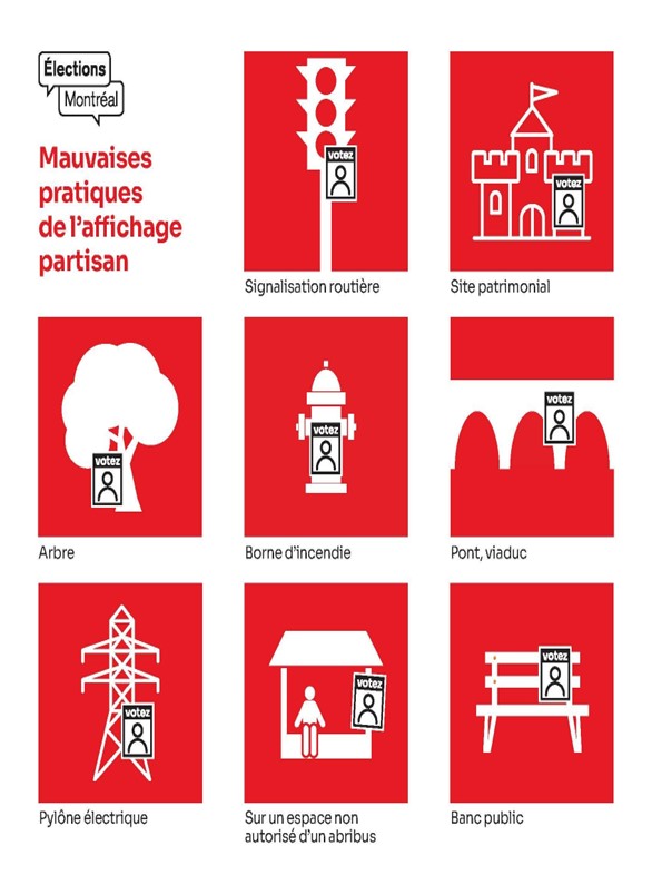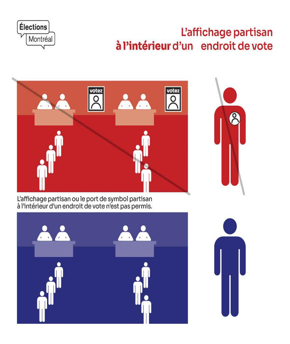 Toute publicité partisane est interdite sur les lieux d’un bureau de vote. Le président d’élection peut faire cesser ou faire enlever toute publicité partisane qui vous favorise ou qui favorise votre parti ou votre équipe, et ce, à vos frais ou à ceux de l’équipe ou du parti. Il doit toutefois d’abord vous demander de cesser ou d’enlever cette publicité partisane (art. 283 de la LERM).