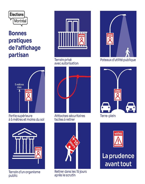 Les pancartes peuvent être installées dès le début de la période électorale. Elles doivent être retirées au plus tard 15 jours après la fin de cette période, soit au plus tard le 17 novembre. Elles ne doivent jamais :